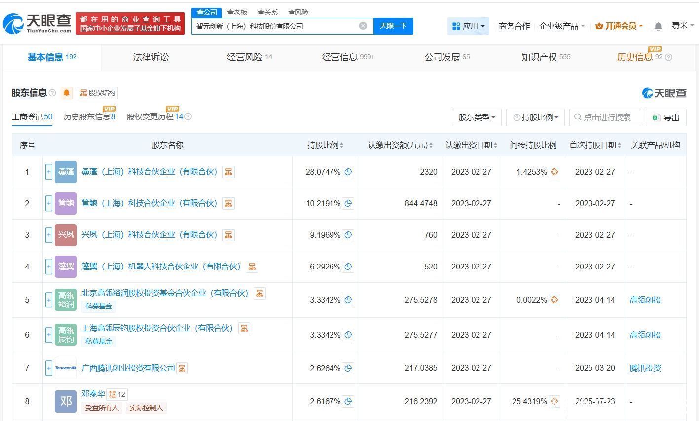 该公司成立于2023年2月,法定代表人为邓泰华,注册资本约8264万人民币,经营范围包括智能机器人的研发、服务消费机器人销售、智能机器人销售等。股东信息显示,该公司由桑蓬(上海)科技合伙企业(有限合伙)、广西腾讯创业投资有限公司、比亚迪(002594)等共同持股。