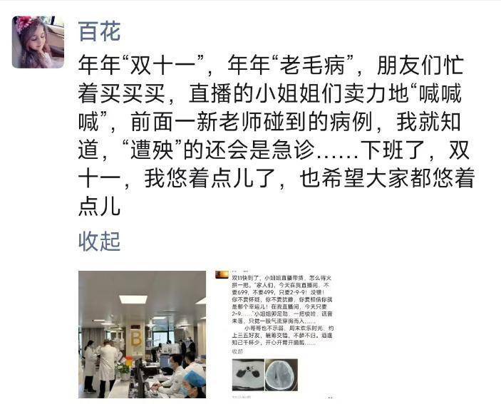 “年年‘双十一’,年年‘老毛病’,朋友们忙着买买买,直播的小姐姐们卖力地喊喊喊……希望大家都悠着点。”几小时前,刚下夜班的浙江省中医院钱塘院区急诊医学科医生王牡丹发了这样一条朋友圈。