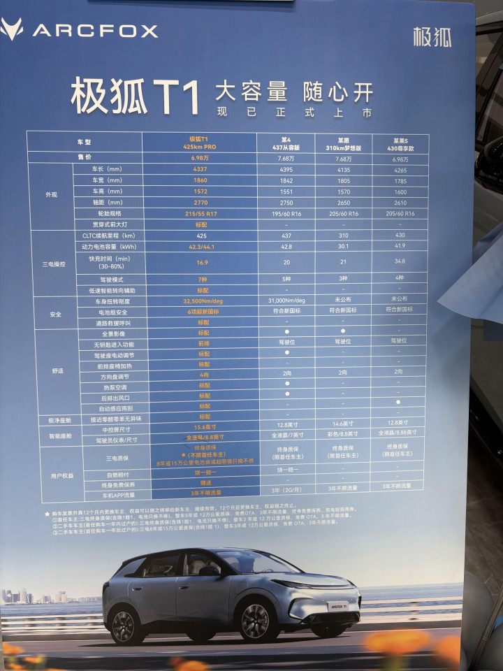 关于这款车的竞品,展车旁边的广告牌上清晰写着“某4、某愿、某果S”,同时还详细对比了和竞品在配置上的差异。可以看到,除了续航表现一般外,极狐T1在空间、驾驶模式数量、安全/舒适性配置以及用户权益上均有不同程度优势。